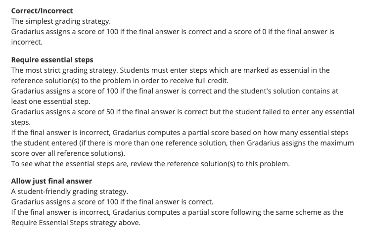 Notice that there are many grading strategies to choose from, and their descriptions can be found under the "Description" link located right underneath "Math grading strategy". Once you click on the link, the descriptions of the available grading strategies will be shown on a pop-up window.