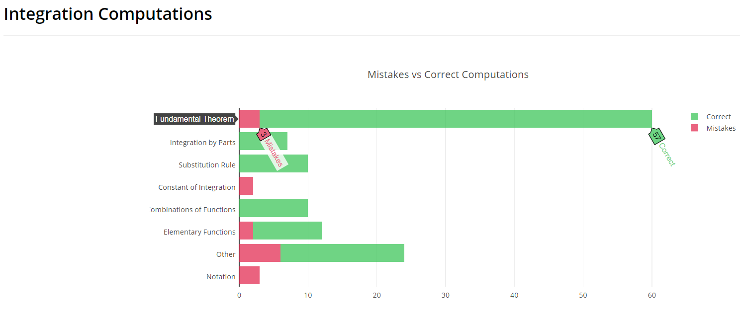 Because Gradarius keeps track of the students' steps and can interpret them, it can generate reports that tell you exactly which topics students are struggling with. For instance, this class seems be doing fine with integral substitution but may need extra help with the integral notation: