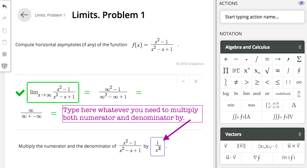 There are many limit actions available in Gradarius. Here we will show you how to work with some of them. Note that most limit actions are used to apply the limit laws such as power law, composition law, product law etc. Note that the best way to learn these actions is to try them and use them.