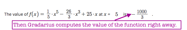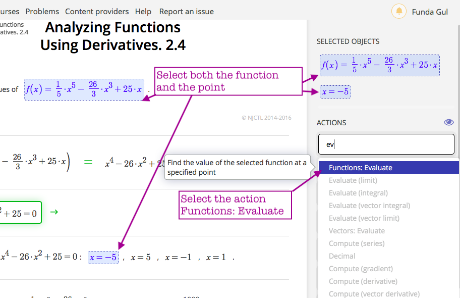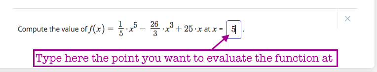 Evaluate at and Evaluate actions are used to compute the value of a function at a point. Note such as with other actions, this action might be disabled by your instructor, if that's the case you will have to compute the value of the function at a specific point manually.